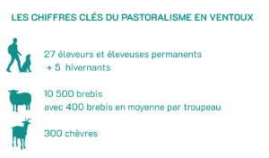 Sur le Ventoux, le troupeau moyen par exploitation est de 400 brebis. On compte également trois gros troupeaux dépassant les 1 000 brebis. Deux éleveurs sont engagés en production caprine laitière, à Brantes et Savoillan. Le territoire accueille environ 10 000 à 10 500 brebis et près de 300 chèvres sur les espaces pastoraux (prairies et forêts). Certains éleveurs intègrent traditionnellement quelques chèvres au sein de leur troupeau de brebis. Le nombre d’éleveurs est stable, voire légèrement en déclin.